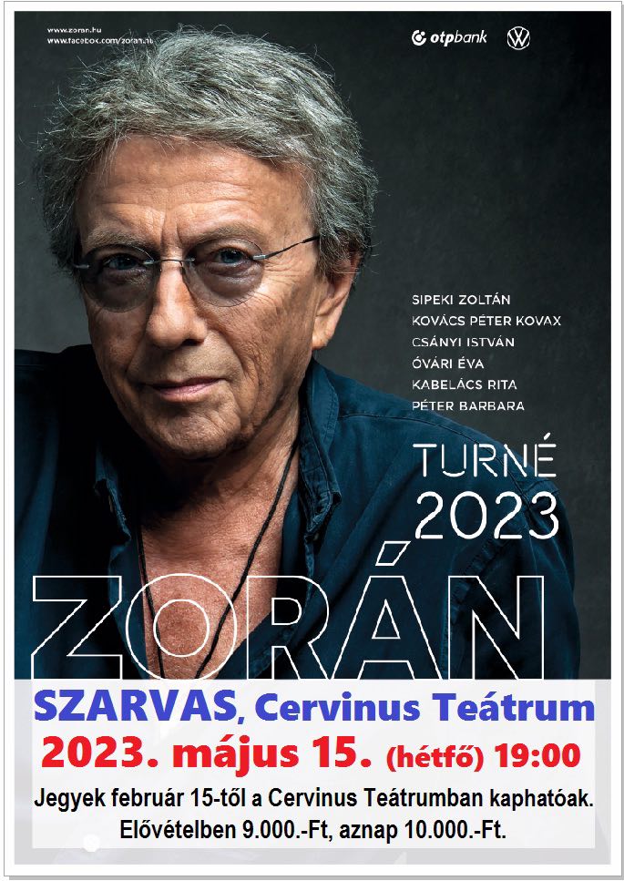 Zorán - Turné 2023hé15máj19:0019:00 Cervinus Teátrum, Kossuth tér 3.Completed