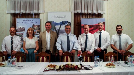 • Hodálik Pál megválasztott polgármester sajtótájékoztatót tart, mellette balról Kiss Attila, jobbról Bartolák Csaba megválasztott képviselők.