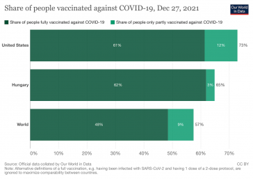 • Az egy dózissal részlegesen (világoszöld), illetve a két dózissal teljesen védettnek tekintett oltottak száma (sötétzöld) az USA-ban, Magyarországon, illetve a világátlag (Forrás: OurWorldInData.org)