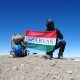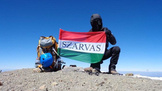 • Molnár Ábel az Ojos del Salado 6893 méteres csúcsán a Szarvas feliratú nemzetiszín zászlóval